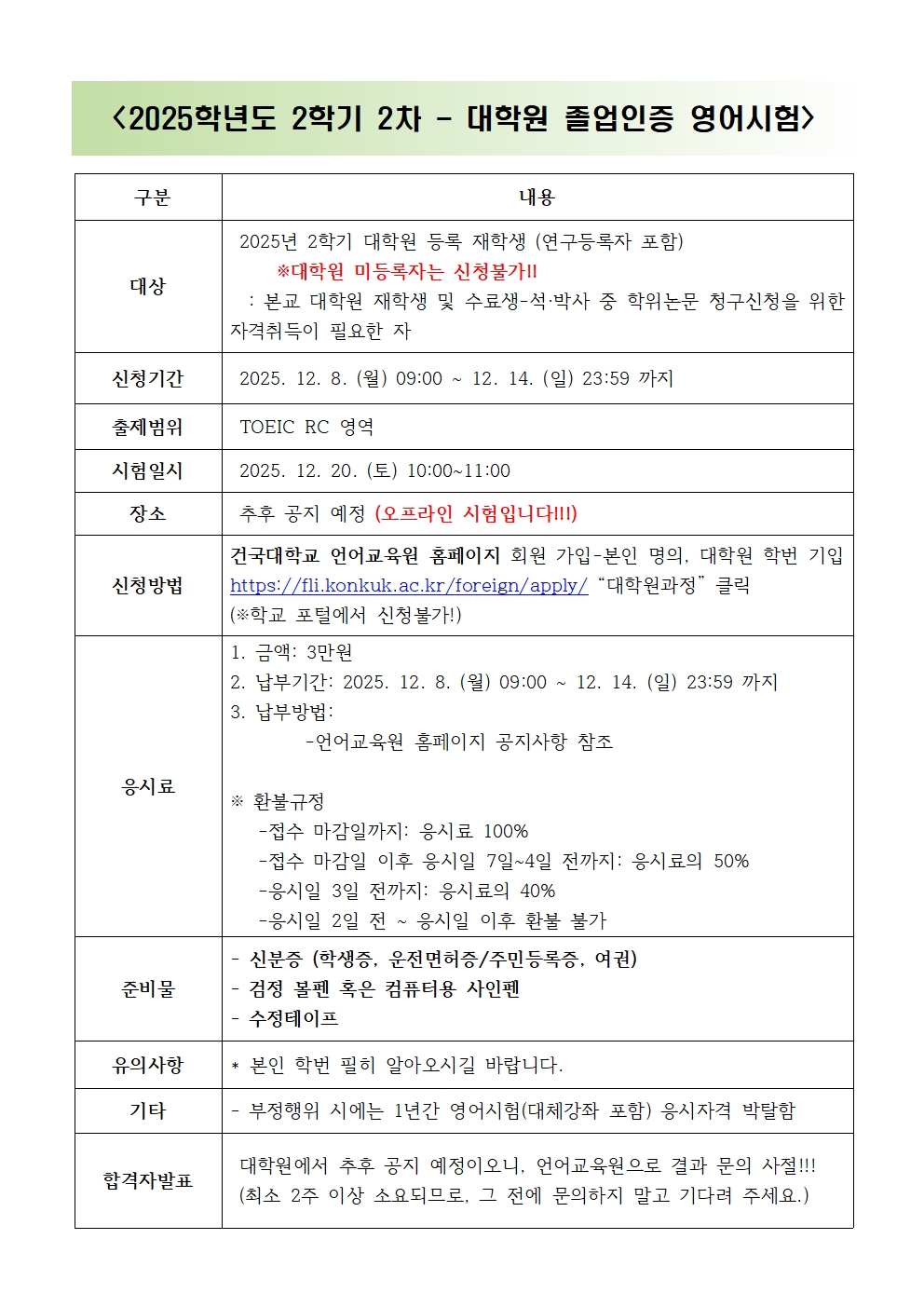 [2025년 2학기 2차 대학원 졸업인증 영어시험]-신청 방법 안내